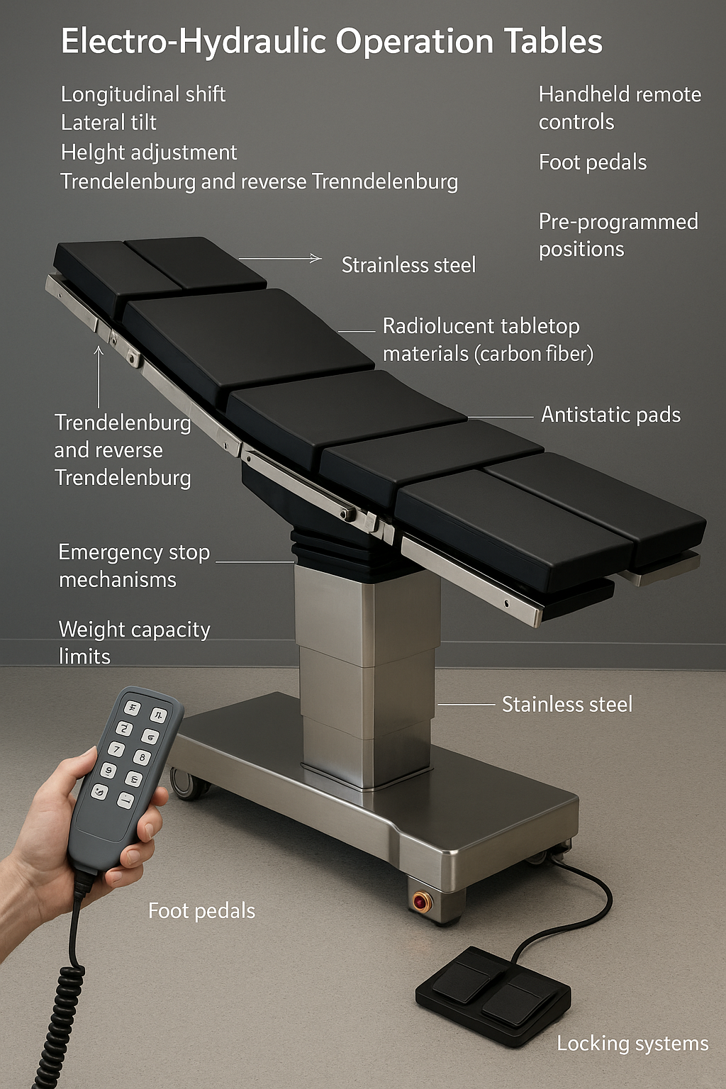 | Fjärrkontroll eller fotkontroll | Ger användarvänliga justeringskontroller | Minskar manuell insats för medicinsk personal |