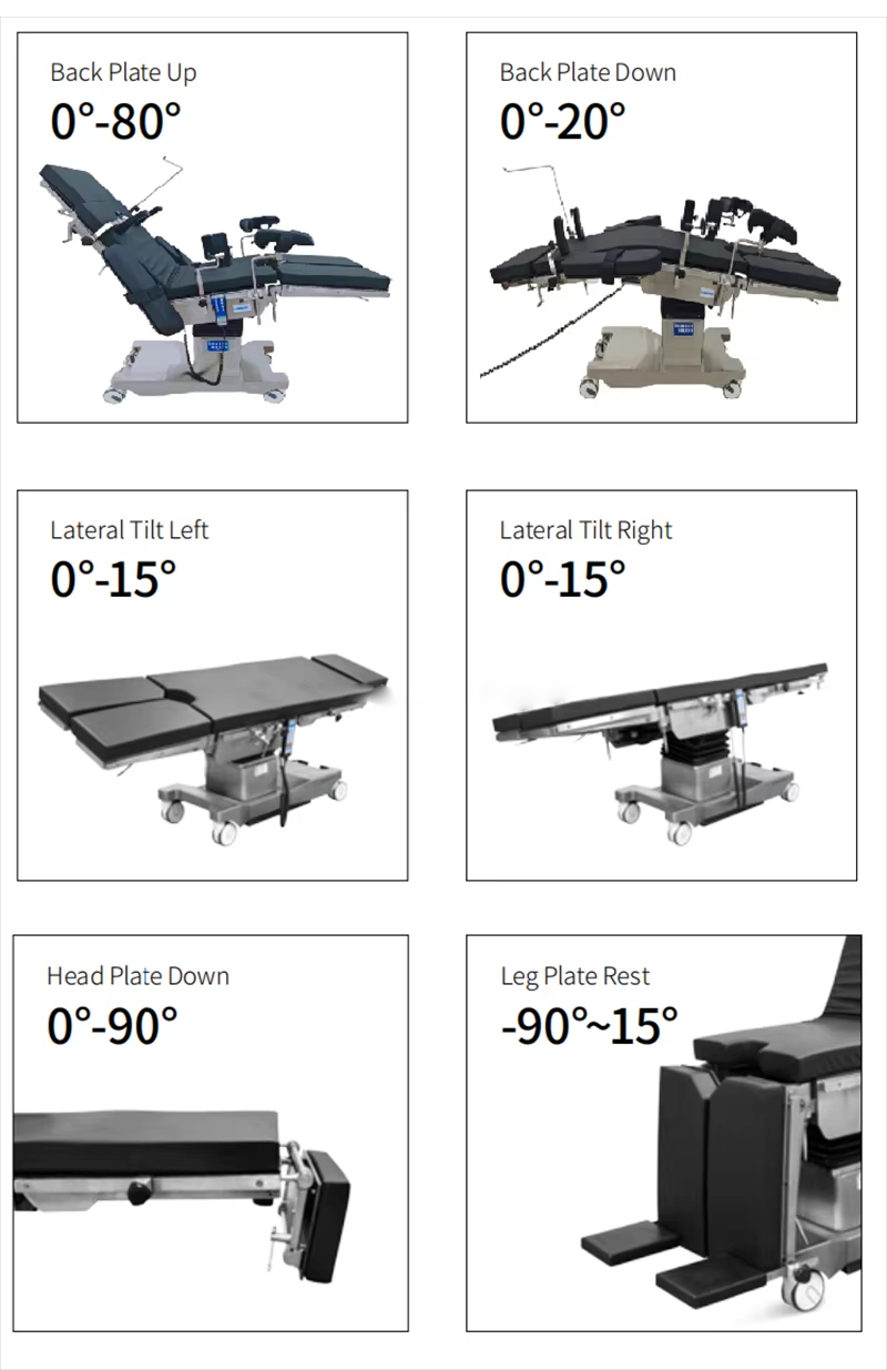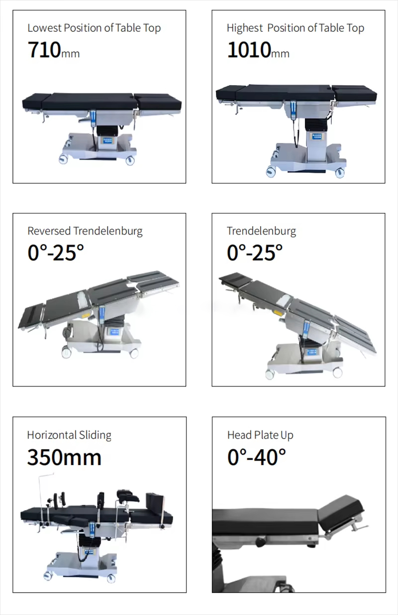 Bordet är uppdelat i fyra sektioner: huvud, rygg (inklusive midjebro), höft- och bensektion; Bordsskivan är gjord av höghållfast kompositmaterial med röntgentransmission; Den kan samverkas med en C-arm för att ta bilder.