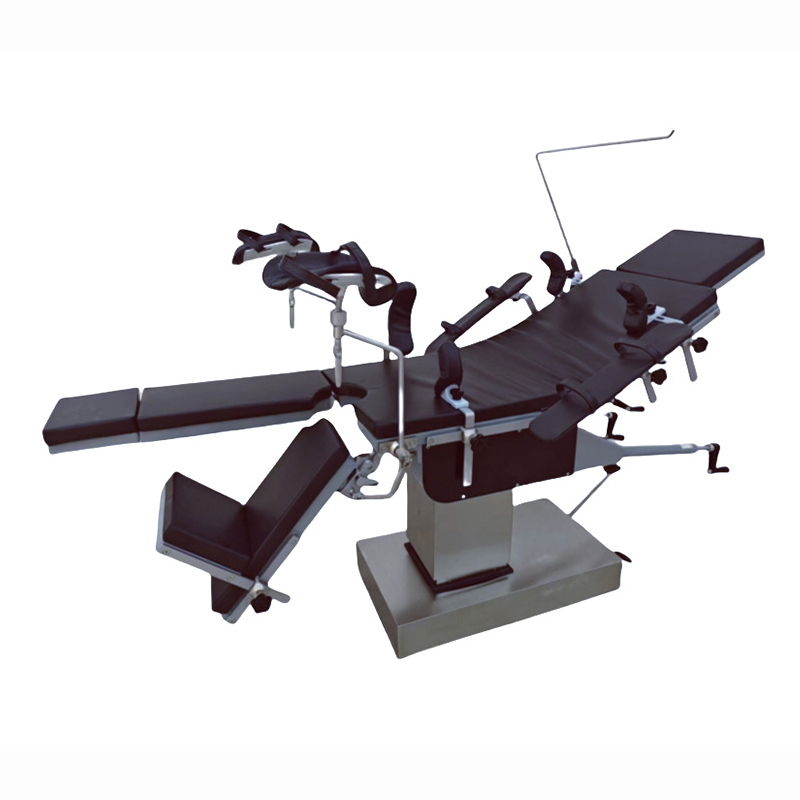 YGS3008B Multifunktionshydrauliskt operationsbord är en högpresterande medicinsk anordning som lämpar sig för en mängd olika kirurgiska operationer. Det används ofta i huvud och nacke, bröst och mage, perineum, lemmar, såväl som obstetrik, gynekologi, oftalmologi, otolaryngologi och ortopedi. Operationsbordet består av en sänggavel, rygggavel, midjebräda, höftbräda och delad benbräda. Varje komponent kan justeras exakt. Upp- och nedfällningen, lutning fram och bak, vänster och höger lutning av ryggbrädan och benbrädan kan styras av handvevade växlar, snäckväxlar och kuggstångssystem för att säkerställa stabiliteten och noggrannheten i operationen. Det hydrauliska lyftsystemet drivs av en fotmanövrerad hydraulpump, som är lättmanövrerad och ljudlös, och som kan möta behoven av frekventa höjdjusteringar. Operationsbordet har en spraybelagd bordsskiva av kolstål, som är korrosionsbeständig, antioxiderande och lätt att rengöra. Basen och pelarskalen är gjorda av rostfritt stål, vilket är hållbart och stabilt.