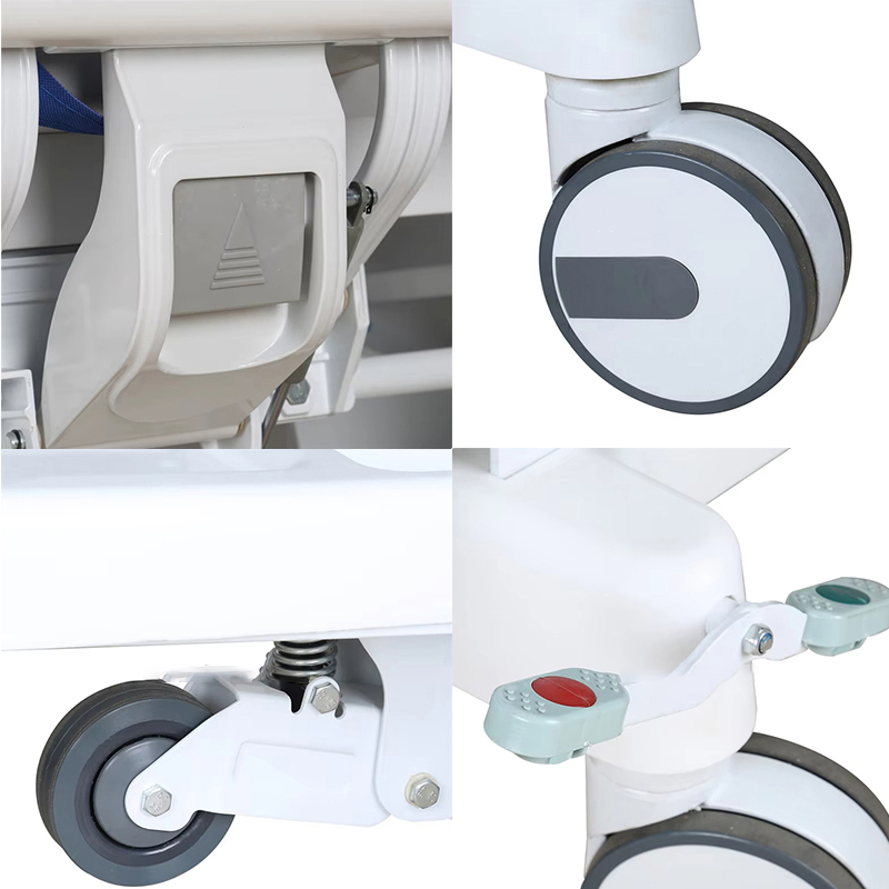5. Förflyttningsfordonets hjul är 4 6-tums dubbelrads mittkontrollhjul, som är tysta, stabila och pålitliga. Samtidigt är de utrustade med styrhjulsanordningar för att underlätta för användarna att styra fordonskarossens riktning. En person kan enkelt använda den, vilket är mer bekvämt och idealiskt;